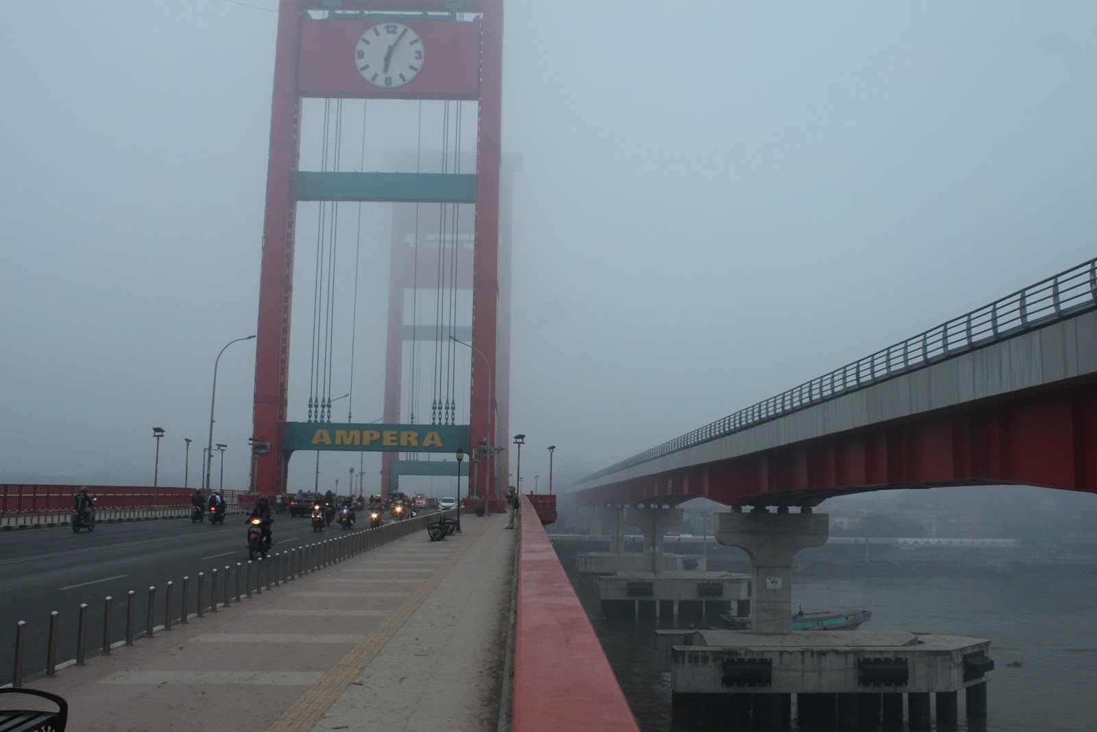 The word "Ampera" was not clearly visible that morning. However, the traffic was still busy on the bridge that divides the Musi river in Palembang City. I tried to get closer to less than 75 meters from the word printed on the middle of the bridge. However, the text located under an analog clock was still blurry even though it was already around 6 am. Visibility in Palembang City has been limited in recent months.