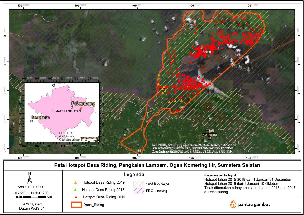 After taking some photos, I continued my journey to Riding Village, which is located in Pangkalan Lampam Subdistrict, Ogan Komering Ilir (OKI) District, South Sumatra Province. The distance is around 70 km or 3 hours by car. Along the way, I had to reduce the speed several times due to the smog covering the road. Based on data from the South Sumatra Regional Disaster Management Agency (BPBD), the smoke in Palembang City probably came from Riding. Daily report from the Media Center Command Post at the South Sumatra BPBD showed that as of Wednesday, 9 October 2019, 57 hotspots were found in OKI District. This number was the highest when compared to 50 hotspots in Musi Banyuasin and less than 10 hotspots in other areas.