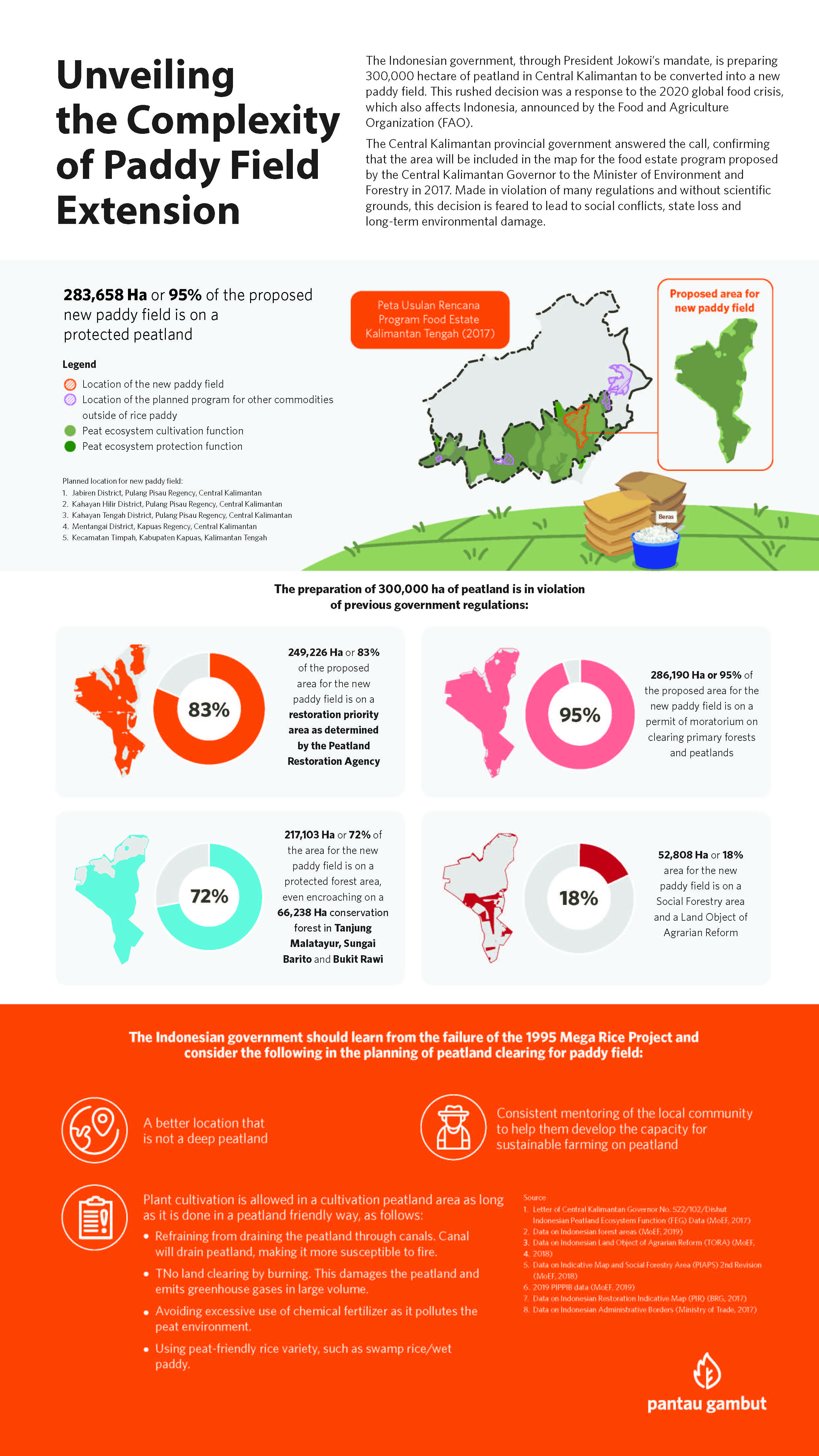 By Pantau GambutAgainst the backdrop of food crisis amid the Covid-19 pandemic, President Jokowi has instructed State-owned Enterprises (BUMN), regional governments and his ministers to convert 900,000 hectare of peatland into new paddy fields in Central Kalimantan. According to the government, 300,000 hectare of peatland is ready to be converted into new food barns. In reviewing the map proposed by the Central Kalimantan Governor to the Minister of Environment and Forestry (Letter No. 522/102/Dishut), Pantau Gambut found that the there is an overlap in the utilization of the 300,000-hectare area with others government policies.